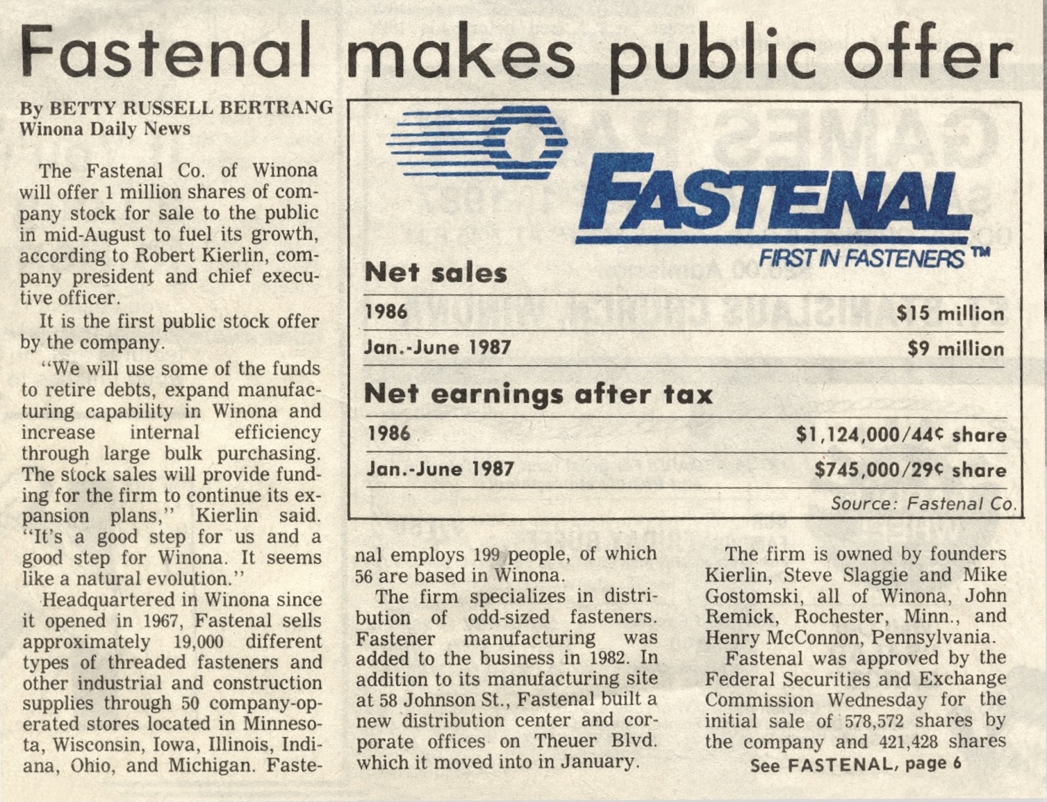 Bob Kierlin和联合创始人Jack Remick、Van McConnon和Steve Slaggie在明尼苏达州威诺纳的拉斐特街69号开设了法思诺。最初,Bob的想法是创建一家配有紧固件自动贩卖机的自助商店,但他们很快转向了更传统的、基于外部销售的服务模式。